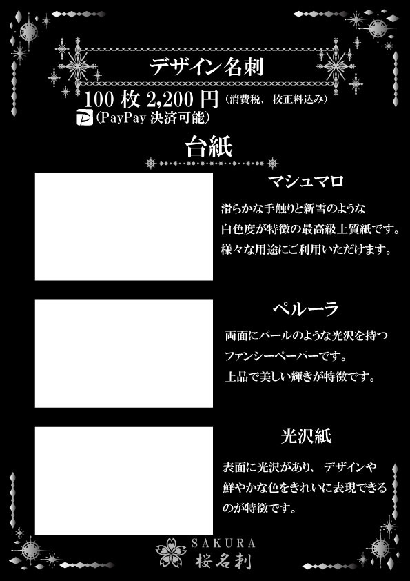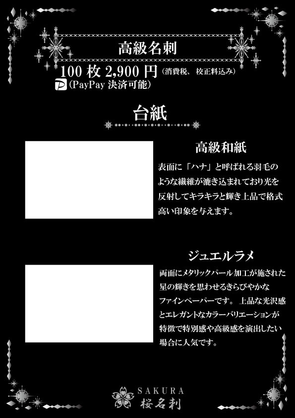 全16パターンからお選びいただき作成いたします。使用する台紙「高級和紙」「ジュエルラメ」は他にはない紙質でありデザインもシンプルだからこそ高級感ある演出での名刺になります。
