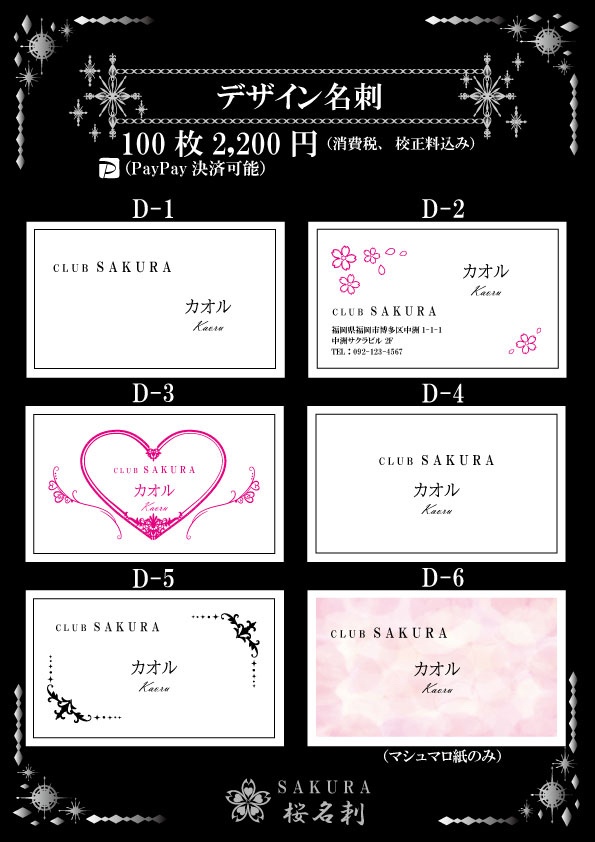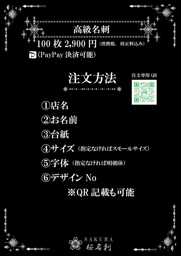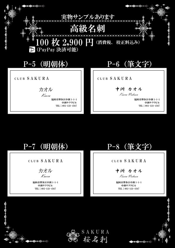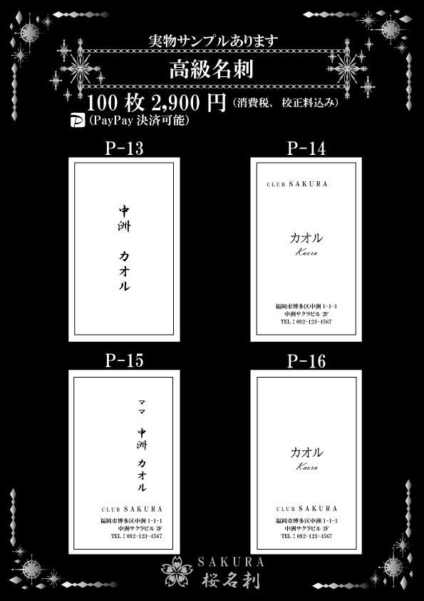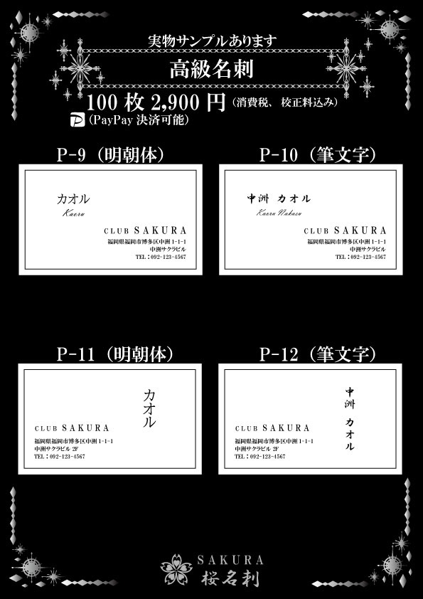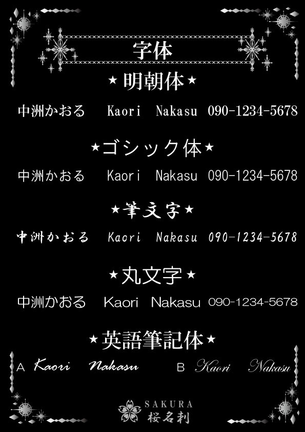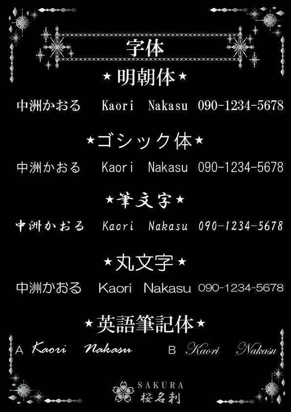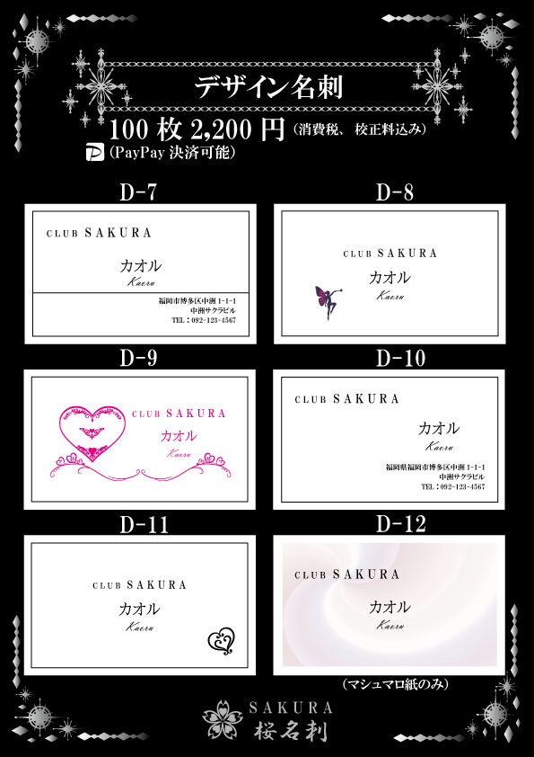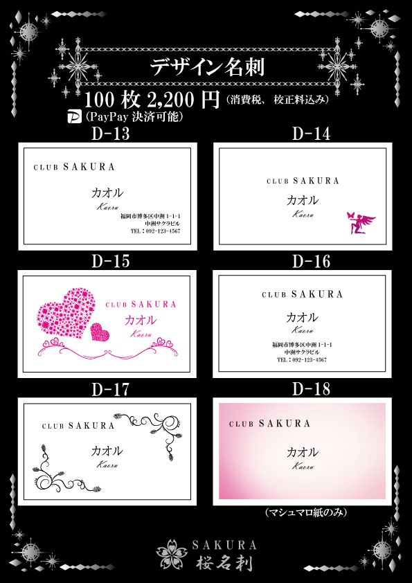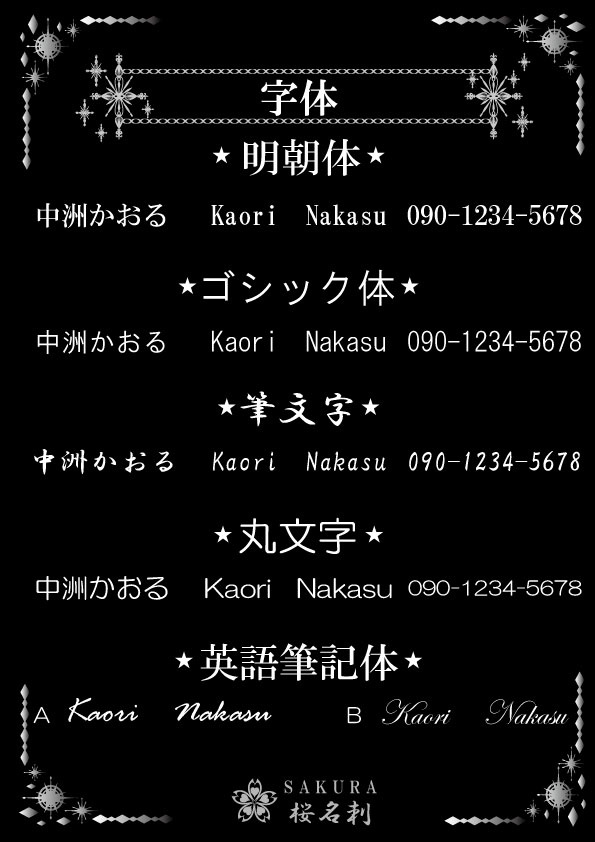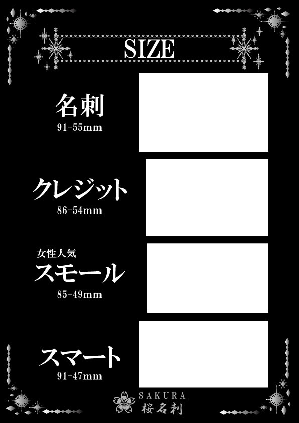全18パターンお好きなデザインをお選びいただき作成いたします。台紙、名刺サイズ、字体もお選びできオリジナリティある名刺が作成できます。