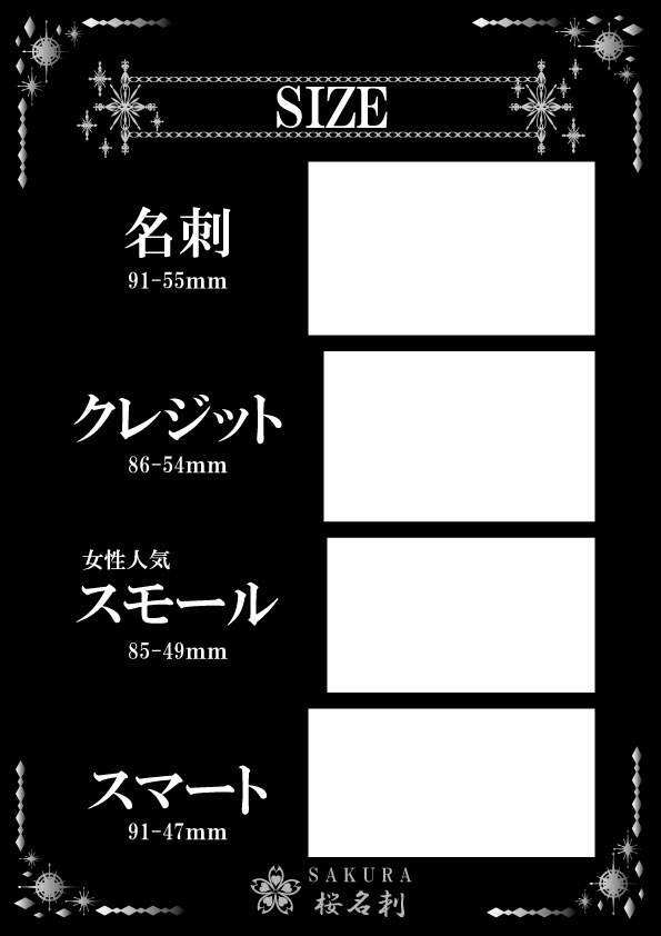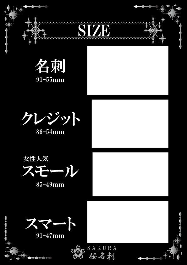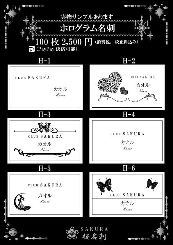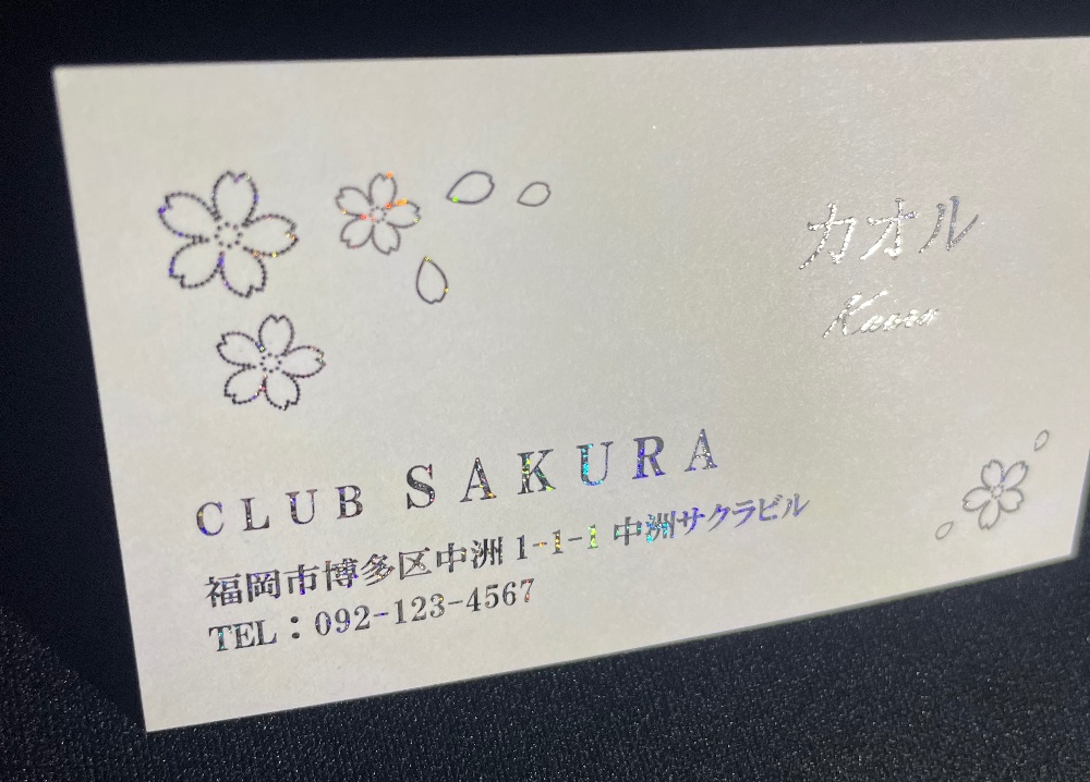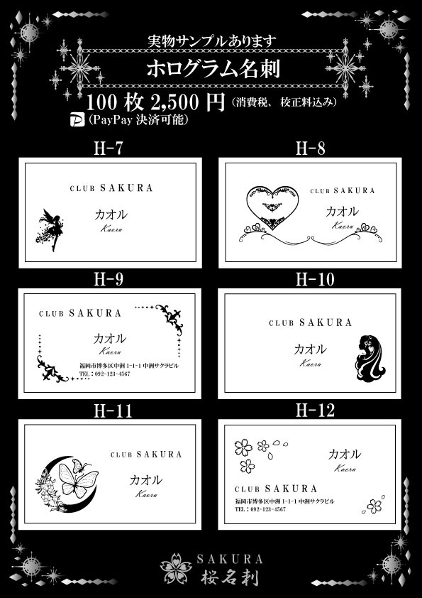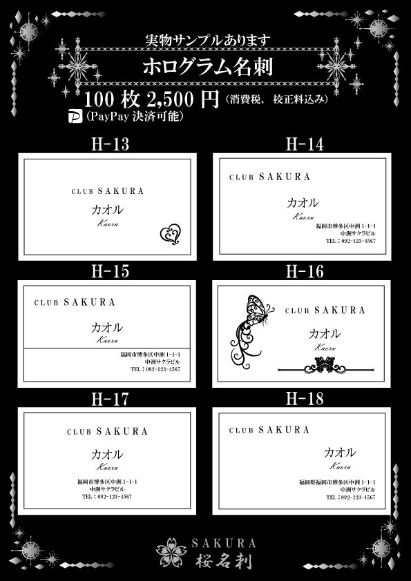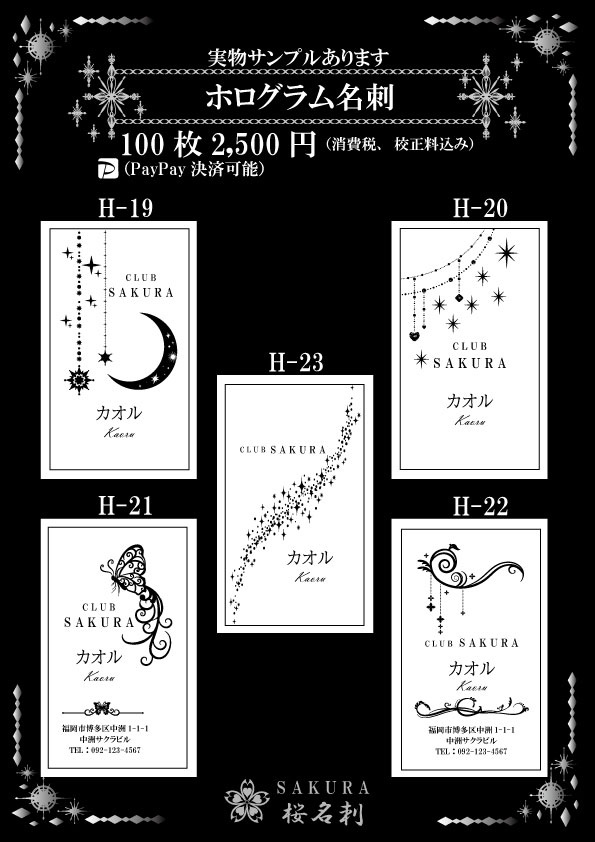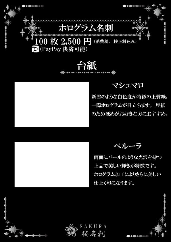 全22パターンからお選びいただき作成いたします。印字部分にホログラム加工がしており見た目はキラキラに輝いており間違いなくインパクトある名刺に仕上がります。